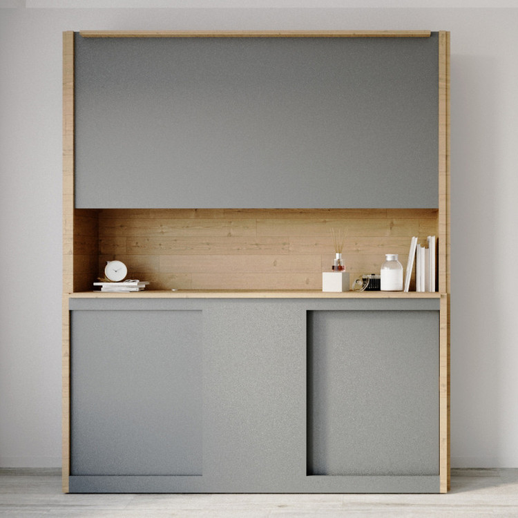 ستونها و قسمتهای رنگ چوب ساخته شده از چوب راش و قسمتهای خاگستری از ام دی اف مرغوب؛ قسمتهای تخته چوبی از فینگرجوینت راش هستند که زیبایی خاصی در جزئیات به محصول بخشیده. دربهای بالا لولایی و دربهای پایین کشویی