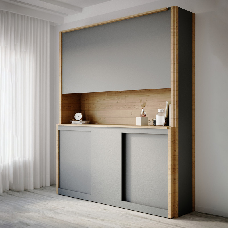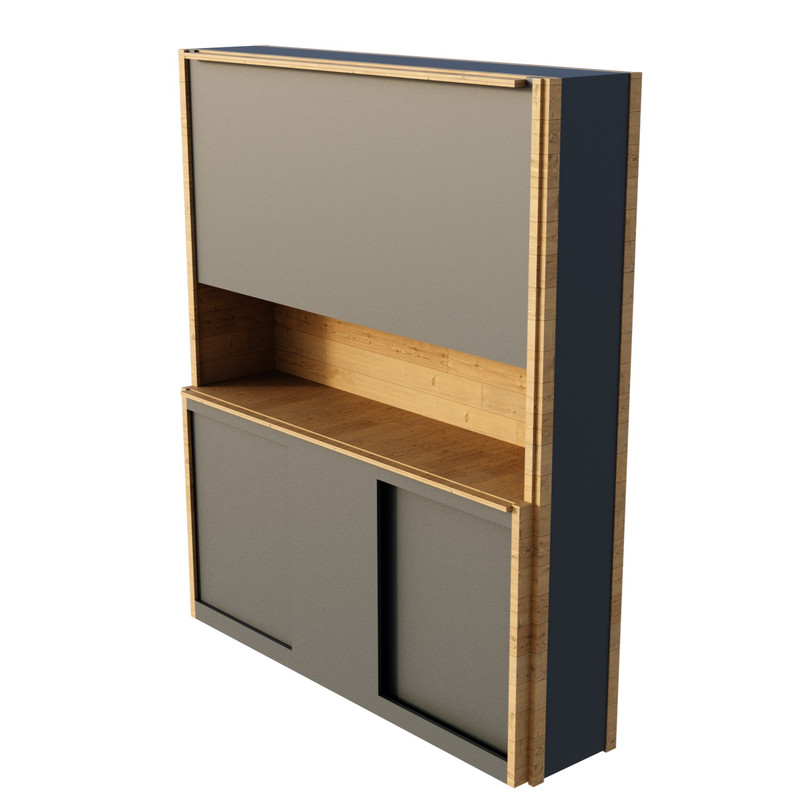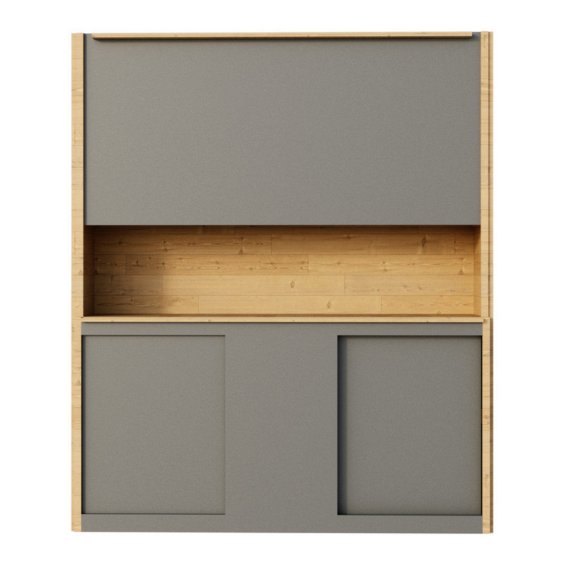 ستونها و قسمتهای رنگ چوب ساخته شده از چوب راش و قسمتهای خاگستری از ام دی اف مرغوب؛ قسمتهای تخته چوبی از فینگرجوینت راش هستند که زیبایی خاصی در جزئیات به محصول بخشیده. دربهای بالا لولایی و دربهای پایین کشویی