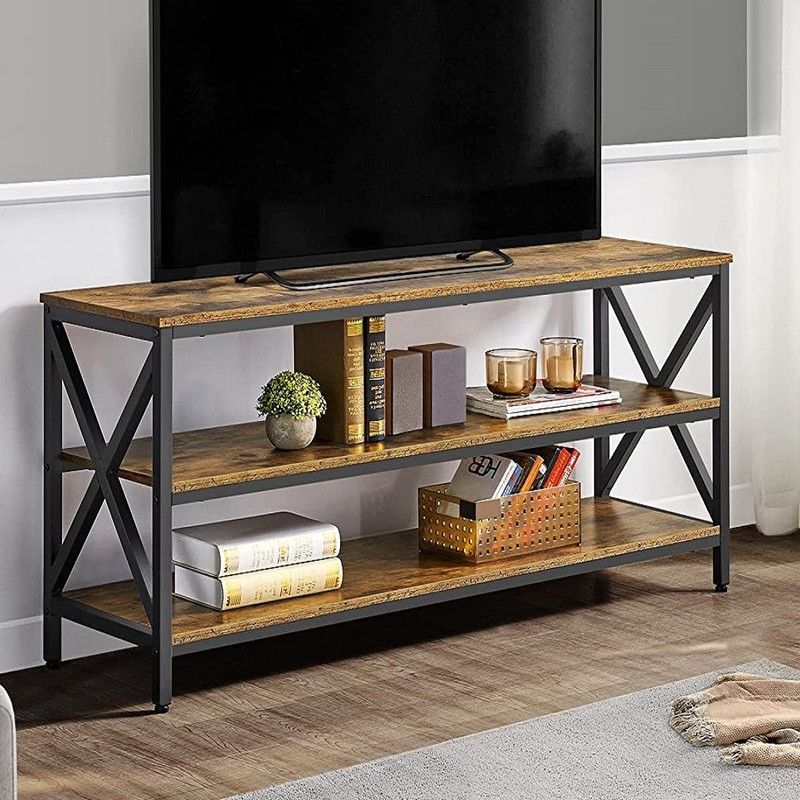 میز تلویزیون ترکیبی از پروفیل آهن و صفحات از جنس چوب کاج روسی سیلر و کیلر زده میباشد . رنگ فریم مشکی مات است که در ترکیب با رنگ قهوه ای چوب ظاهری مدرن و در عین حال به حال و هوای روستایی یا روستیک ایجاد میکند . فریم پروفیل 2 در 2 و چوب روسی ضخامت 2.5 استفاده شده است .