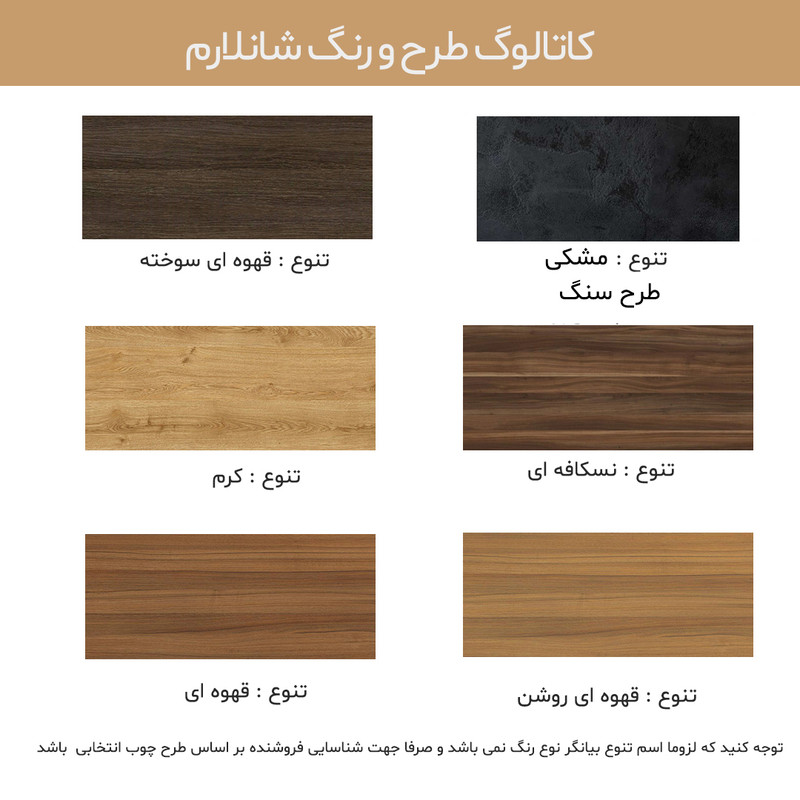 سایر توضیحات : توجه کنید تنوع بر اساس رنگ چوب می باشد و در همه حالت رنگ فلز مشکی مات است. جنس بدنه فراورده های چوب مصنوعی میباشد.